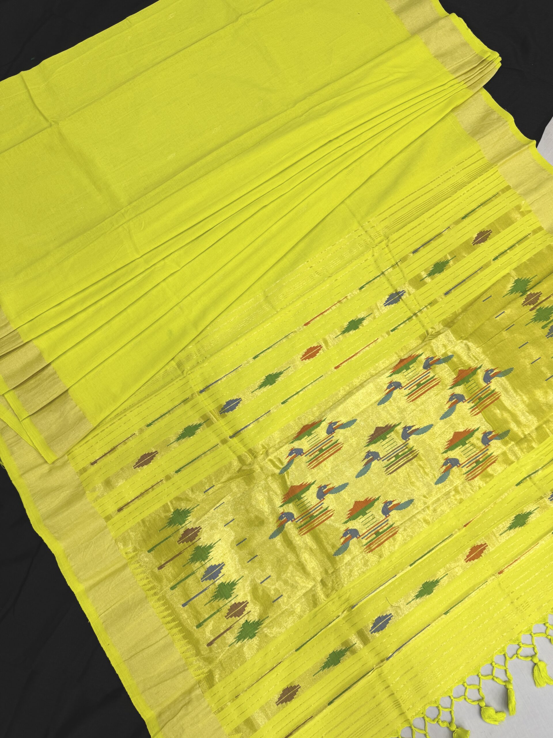 Neon Green Cotton Paithani With Double Pallu and Gold Border.