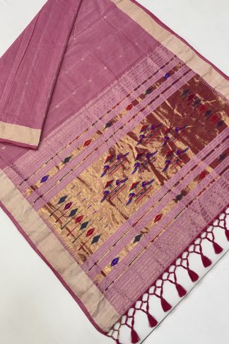 Peach Pink Cotton Paithani With Double Pallu and Gold Border.