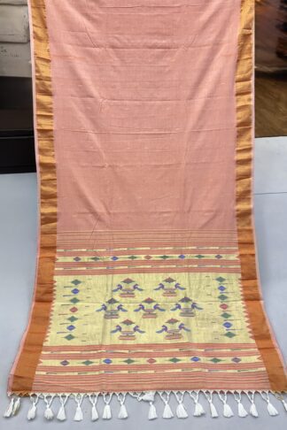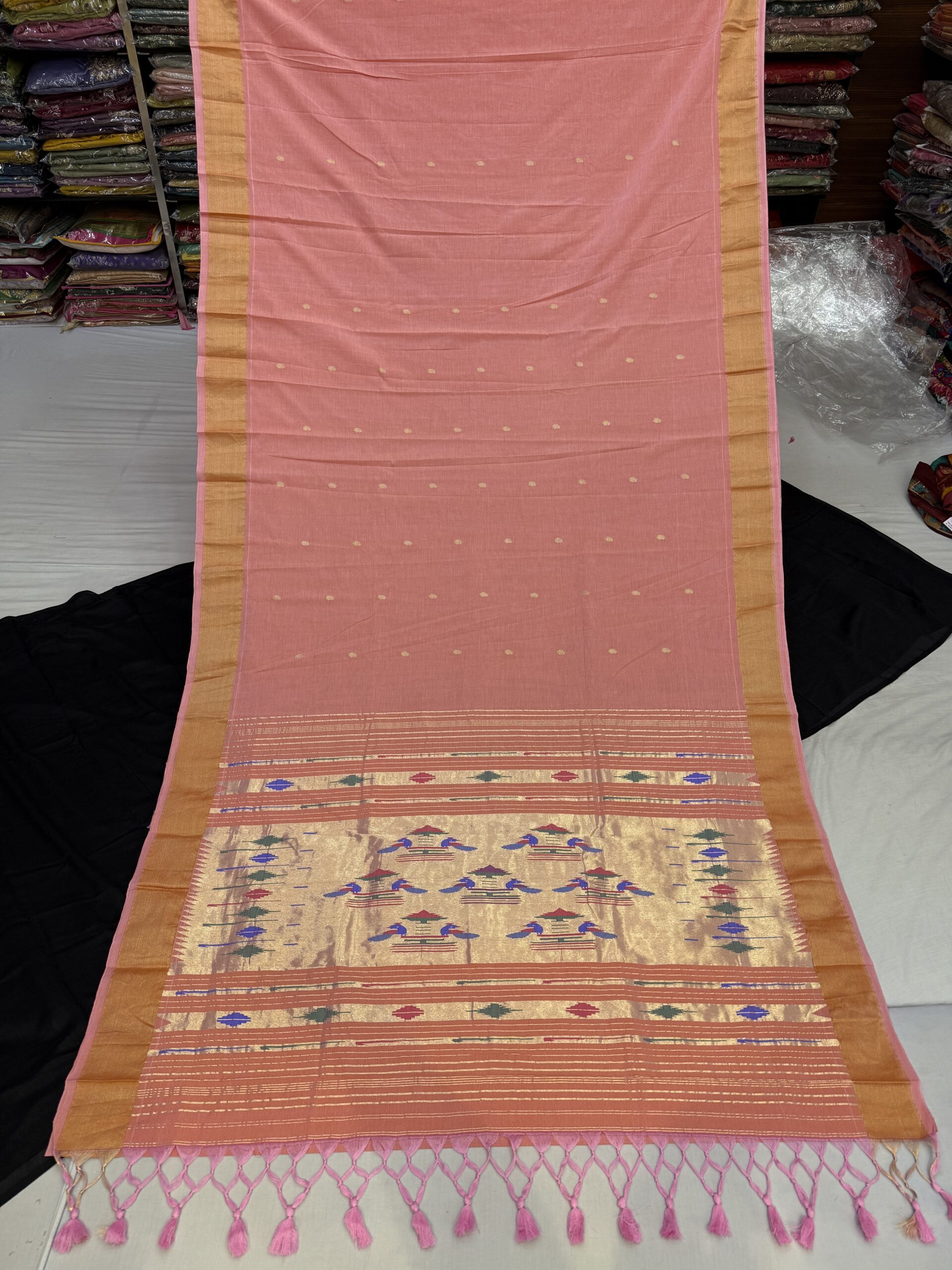 Light Pink Cotton Paithani With Double Pallu and Gold Border.