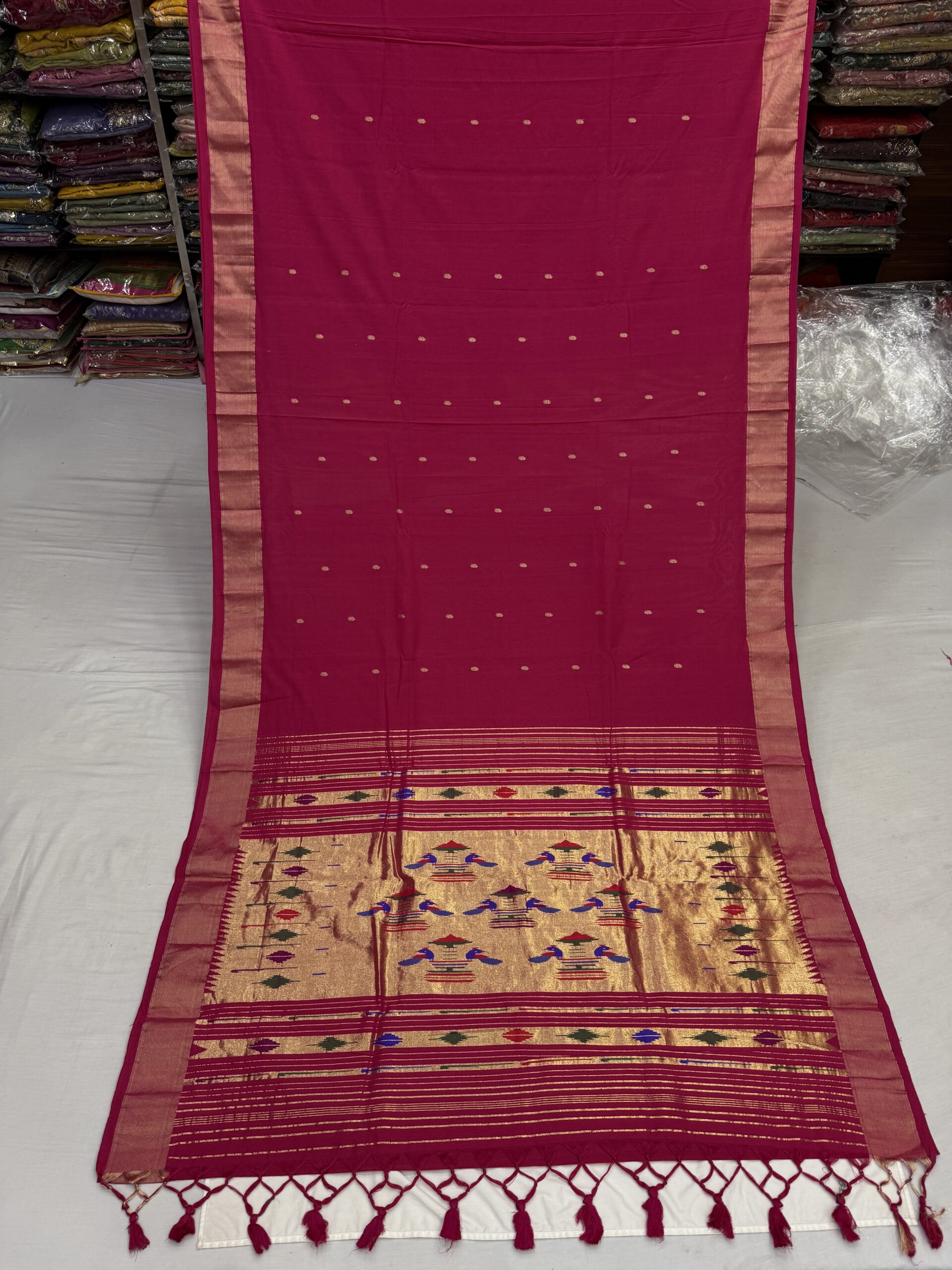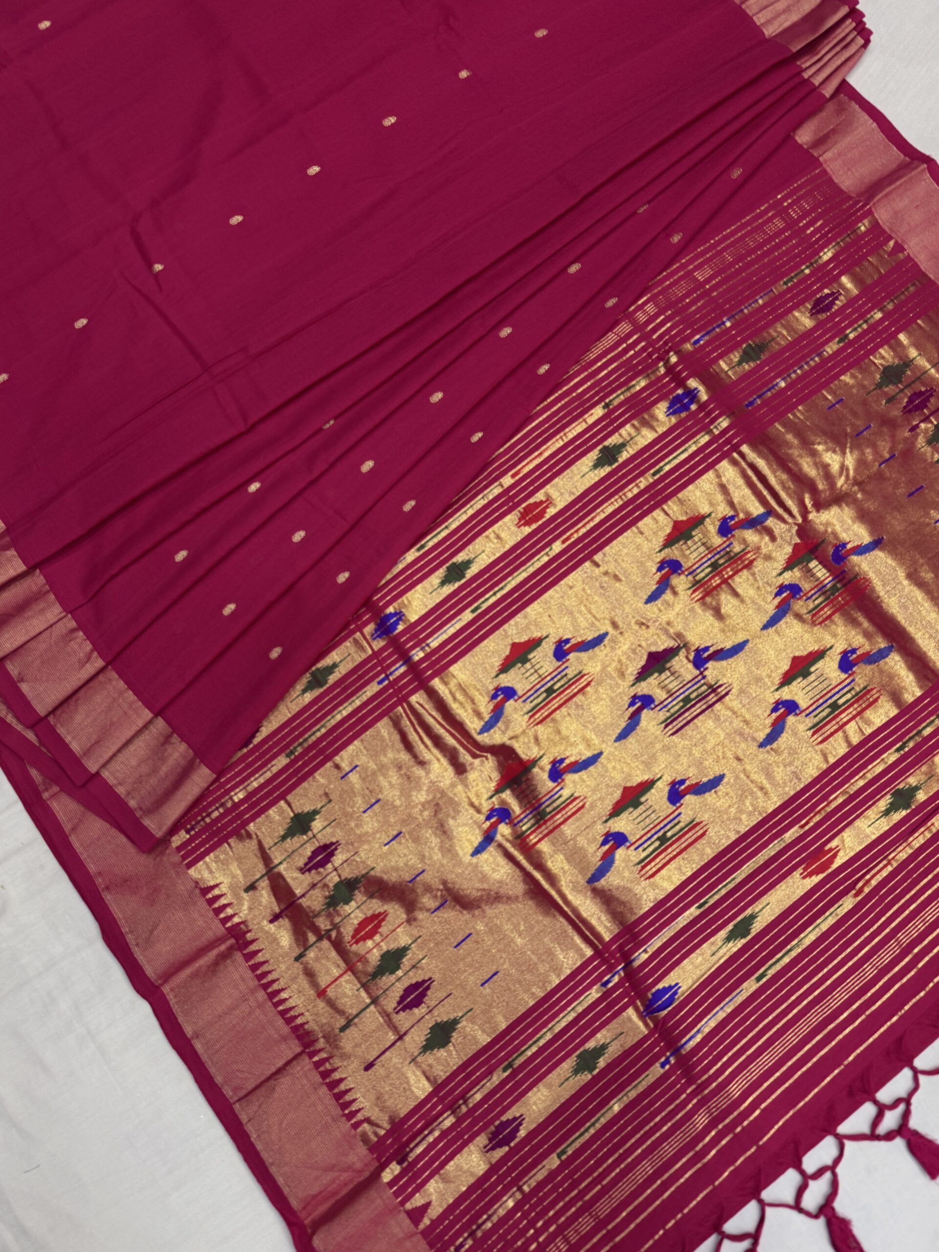 Hot Pink Cotton Paithani With Double Pallu and Gold Border.