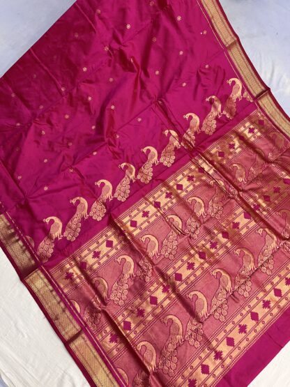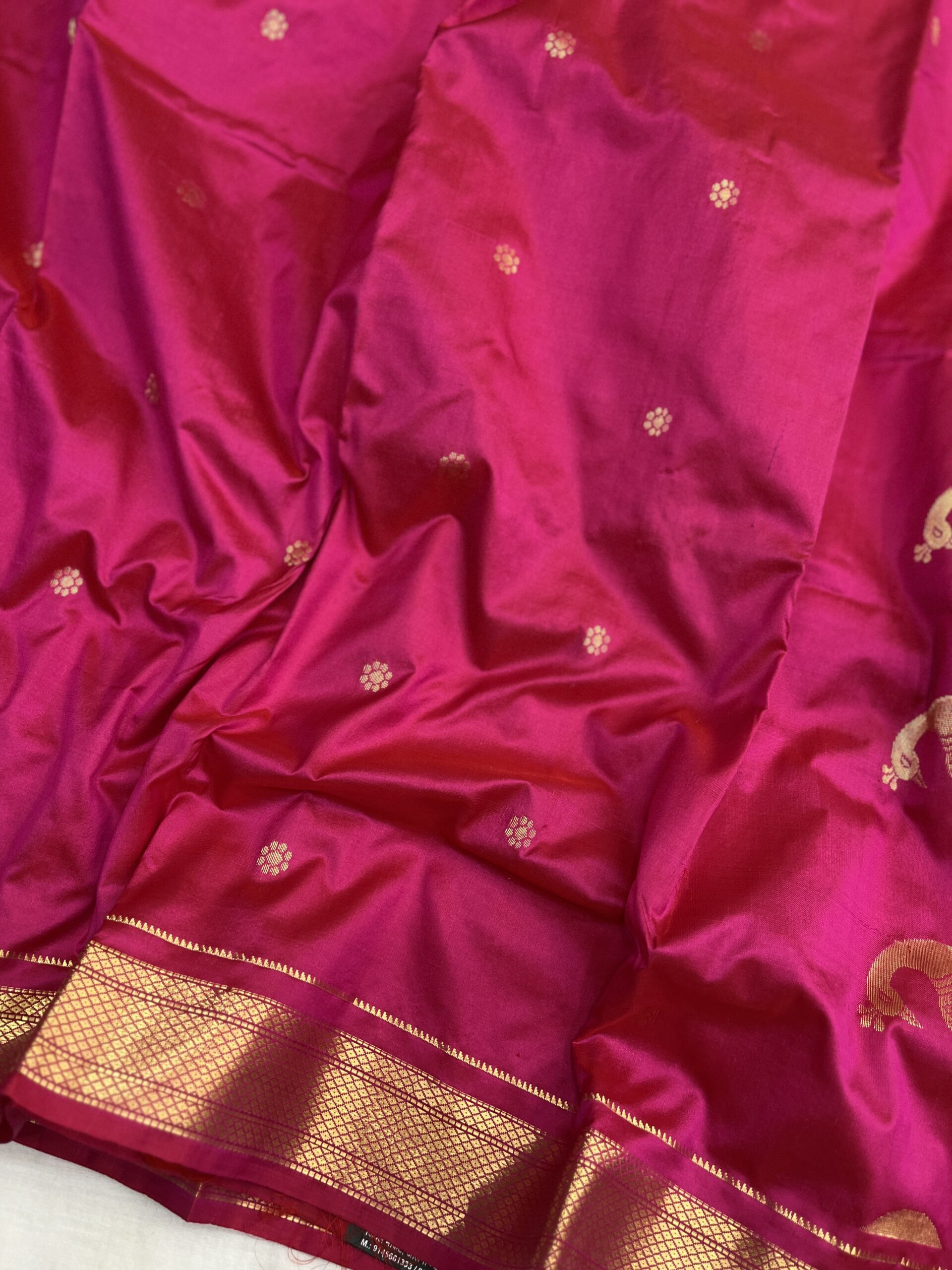 From the land of valor and royalty, where queens once graced darbars in silken grandeur, we bring you the Rajmata Paithani Pure Silk Saree in a majestic magenta pink hue—bold, beautiful, and brimming with heritage.