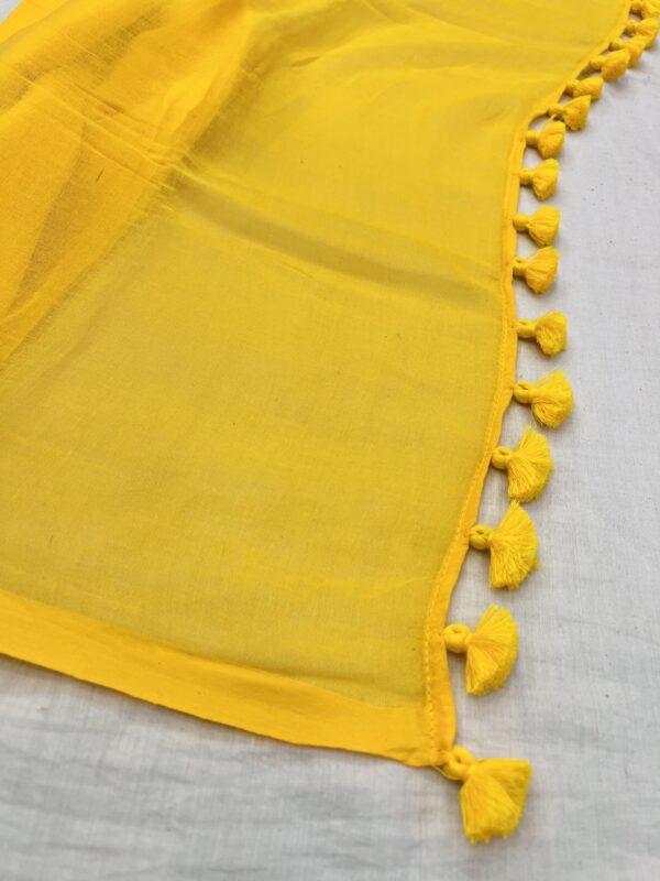 We have this beautiful 6 yard mulmul saree, with pompoms.